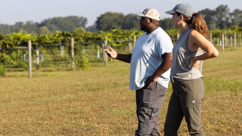 Katie digs into muscadine grapes at Off the Land Farms in North Carolina.