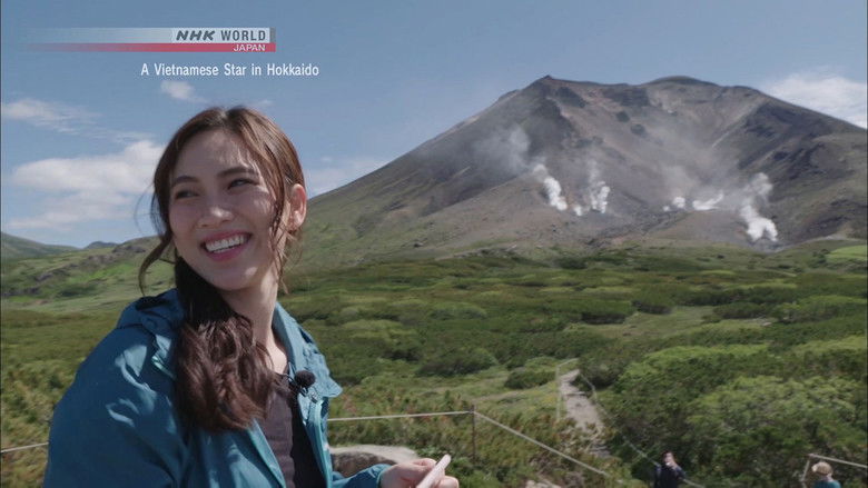 We continue our trip to Hokkaido Prefecture with Phuong Anh Dao, star of the hit Vietnamese film Summer in Closed Eyes. First to Biei and its famous multicolored patchwork crops and 15-hectare flower fields. Here, Anh Dao has a korokke taste test. Next, to Higashikawa, famous for a shrine that's over 120 years old, an eatery featuring fresh local cuisine, and clear mountain water used to make tofu, coffee and more. Finally, to Mt. Asahidake for a ropeway ride and a scenic climb to cap off the trip.