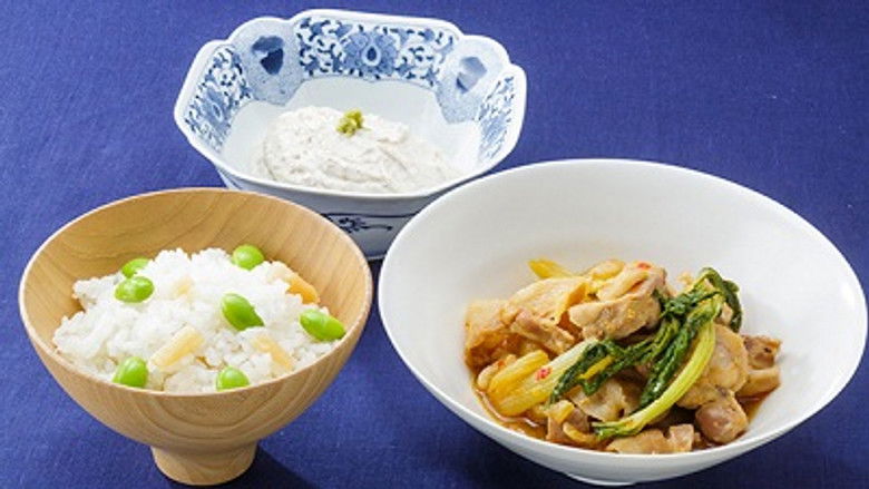 In this episode, we'll be cooking rice with the increasingly popular worldwide favorite, edamame. Our main dish will be a steamed dish featuring celery, our MC Patrick's favorite. We'll layer the celery with both pork and chicken and flavor it all with a sauce made from doubanjiang, a spicy seasoning paste from China, and miso paste from Japan. This easy-to-make recipe provides a wonderfully complex blend of vegetable and meat flavors, making it the perfect dish to serve guests.